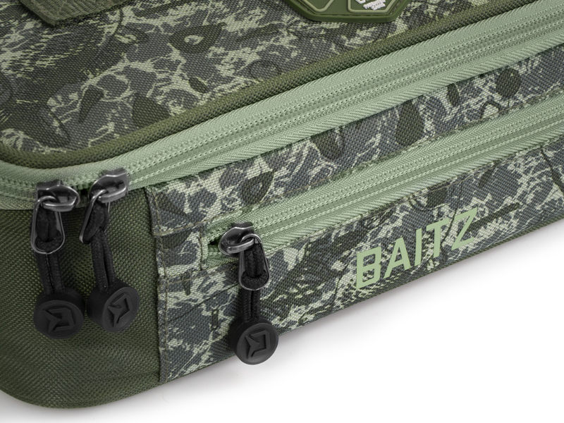 BAITZ je kompaktná taška, špeciálne navrhnutá na uskladnenie a prenos dipovaných nástrah. V základe obsahuje 6 kusov transparentných plastových dóz s vekom a tesnením. Vïaka tesneniu môžete do dóz bez obáv uskladni nadipovaný boilies, pelety, èi iné nástrahy. Vo vnútri tašky sa nachádzajú prepážky, ktoré vytvárajú šes rovnakých individuálnych priehradok. Práve v týchto priehradkách budú dózy s nástrahami vždy dokonale organizované a pripravené na použitie.